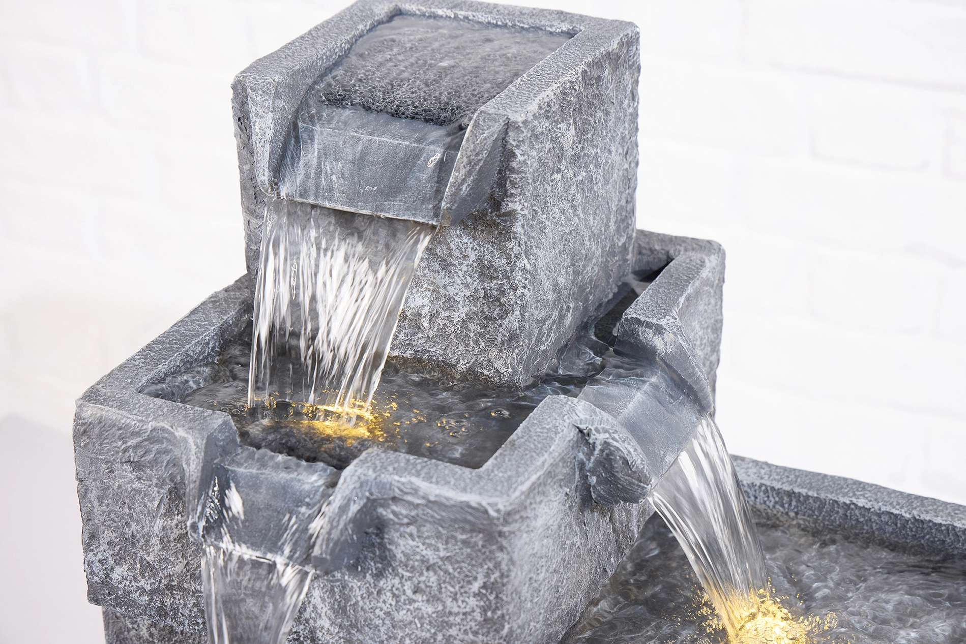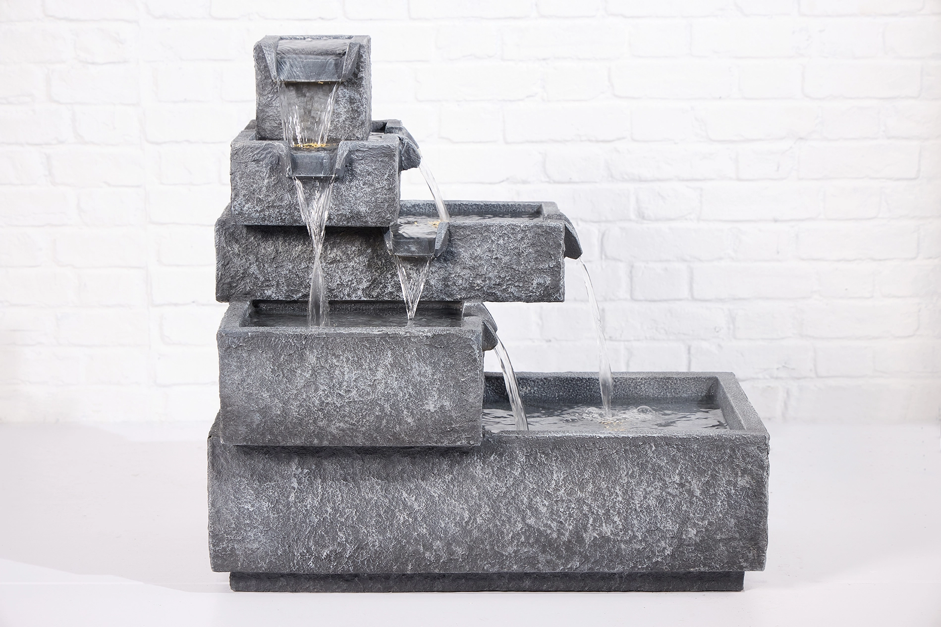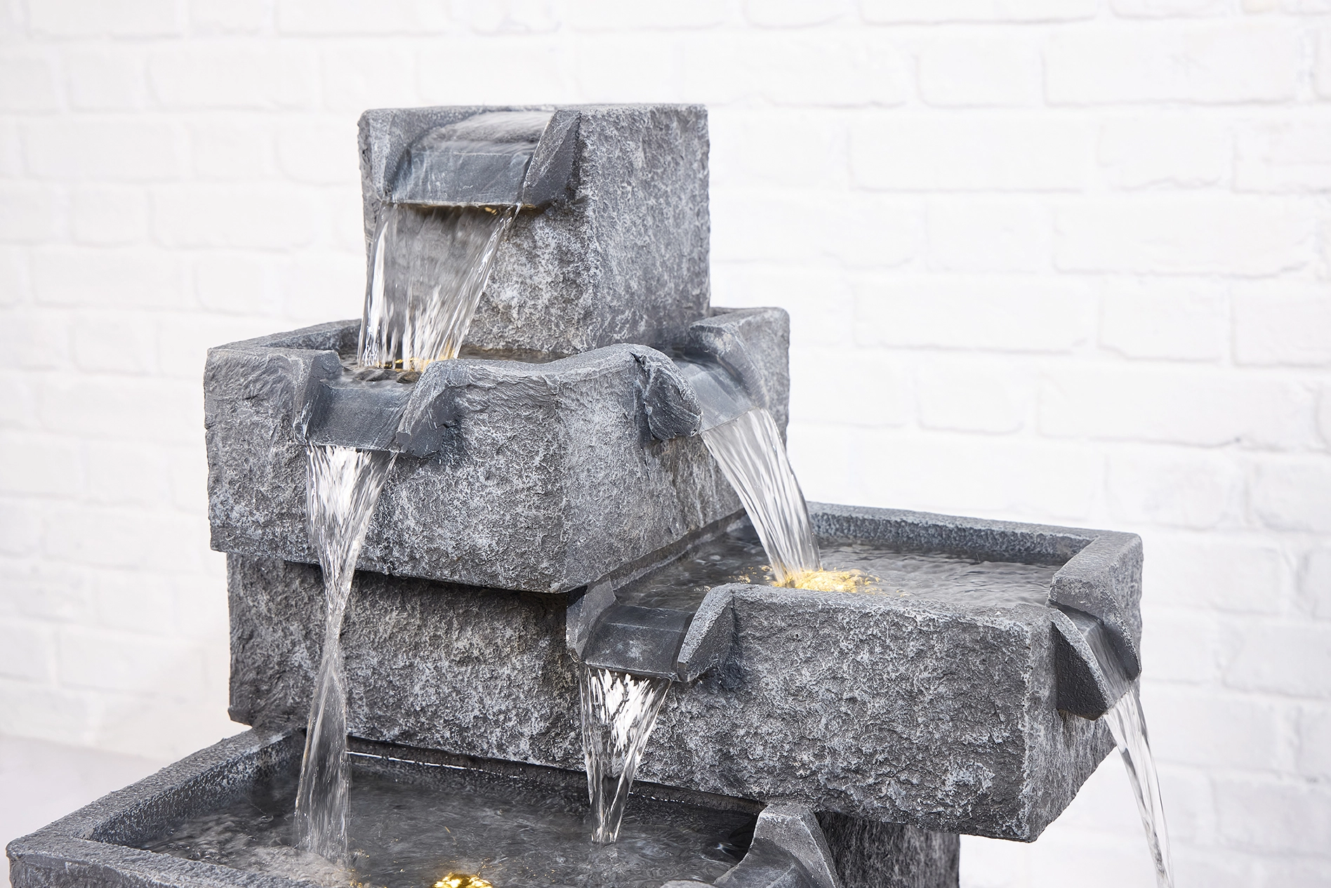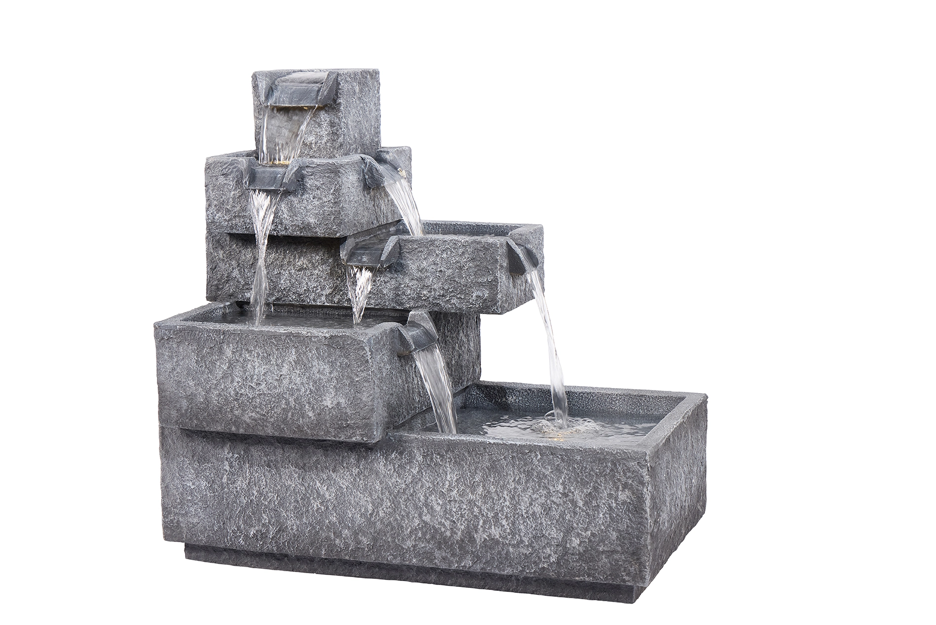 Modern yet natural, Acadia features tiered stone-like bowls with cascading water and ambient LED lighting.
