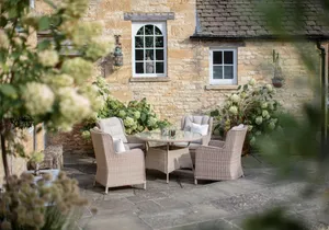 Upgrade your outdoor relaxation space with the Chedworth 120cm Table with 4 High-Back Armchairs & Parasol in a stylish sandstone finish. Order now from our webshop or visit Trioscape Garden Centre to explore more garden furniture options!