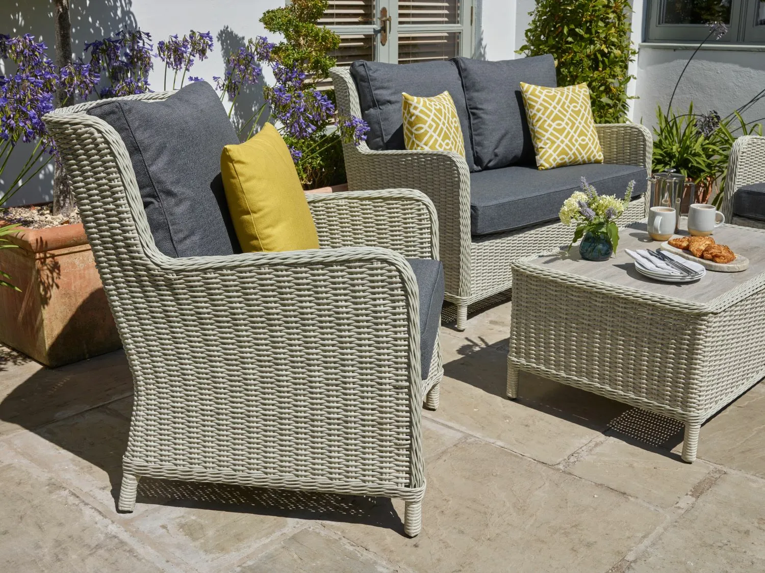 Upgrade your outdoor relaxation space with the Chedworth 2 Seat Sofa with 2 Sofa Chairs & Coffee Table with Ceramic Top in a stylish Dove Grey finish. Order now from our webshop or visit Trioscape Garden Centre to explore more garden furniture options!