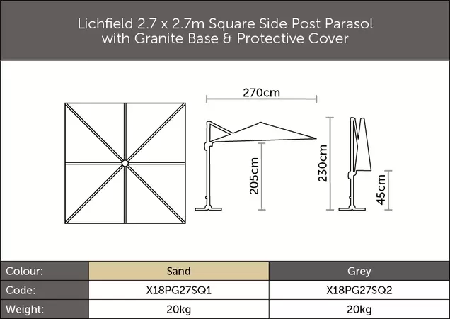 Lichfield 2.7m x 2.7m Square Parasol (includes Granite Base & Protective cover) - Grey