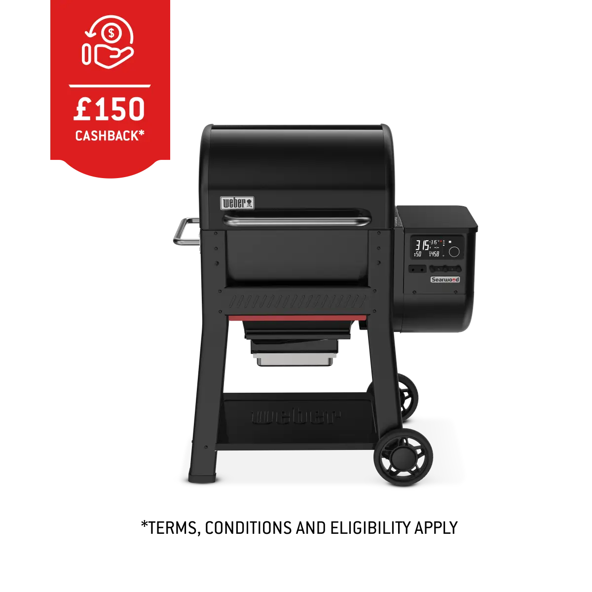 Smoke, sear, roast, and more on the Searwood® Pellet Barbecue featuring a full temperature range from 80° to 315°C and DirectFlame cooking that creates bold flavourful sear marks and delicious golden browning. The Searwood® Pellet Barbecue heats up in 15 minutes or less† , cooks evenly and features a full grate Sear Zone that lets you get more food on the flame. Cook confidently with intuitive digital controls at the barbecue and Wi-Fi® and Bluetooth® connectivity that allows you to monitor and control the barbecue remotely, see live graphs of your cook, get readiness alerts, recipes, and more from the Weber Connect® app on your smartphone. Explore new techniques with a rotisserie or griddle insert (each sold separately). Then clean up quickly and easily with the pull and clean grease and ash management system located at the front of the barbecue. †Based on lab conditions of 25°C ambient temperature with premium hardwood pellet fuel.