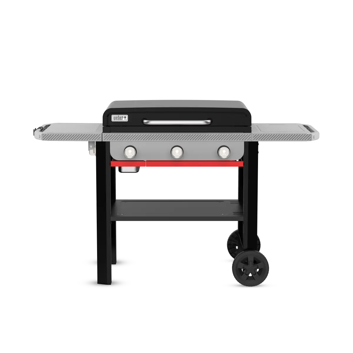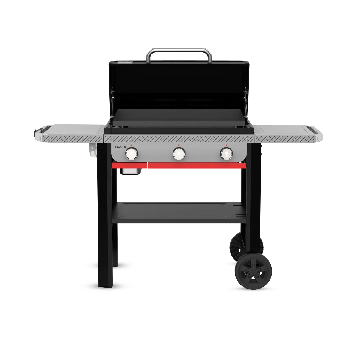Have more fun griddling on the game-changing Weber® Slate® GP 71cm Premium Griddle. Its stick-resistant, porcelain-enamelled cooktop is ready to cook on right out of the box so you can create juicy smashed burgers, flavourful stir-fries, beautifully seared seafood, vegetables and more. This griddle quickly heats up to more than 260°C and provides even heat across the surface. Wind guards prevent the burners from blowing out, and the cooktop is set close to the burners to ensure a steady temperature. Three independently controlled burners allow for multi-zone heat, so you can cook perfect pancakes on low while crisping up bacon on high all on the same cooktop. The surface is safe for metal tools, so you can flip, press and scrape without worry. The left-hand side table folds down to save space when you’ve finished.