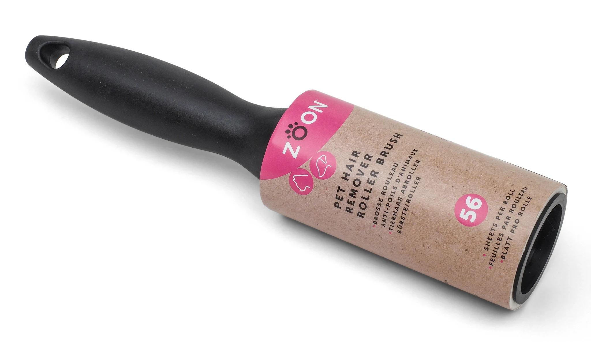 The Zoon Pet Hair Remover Roller Brush features 56 sticky sheets per roll, making it ideal for quickly removing pet hair from clothing and upholstery.